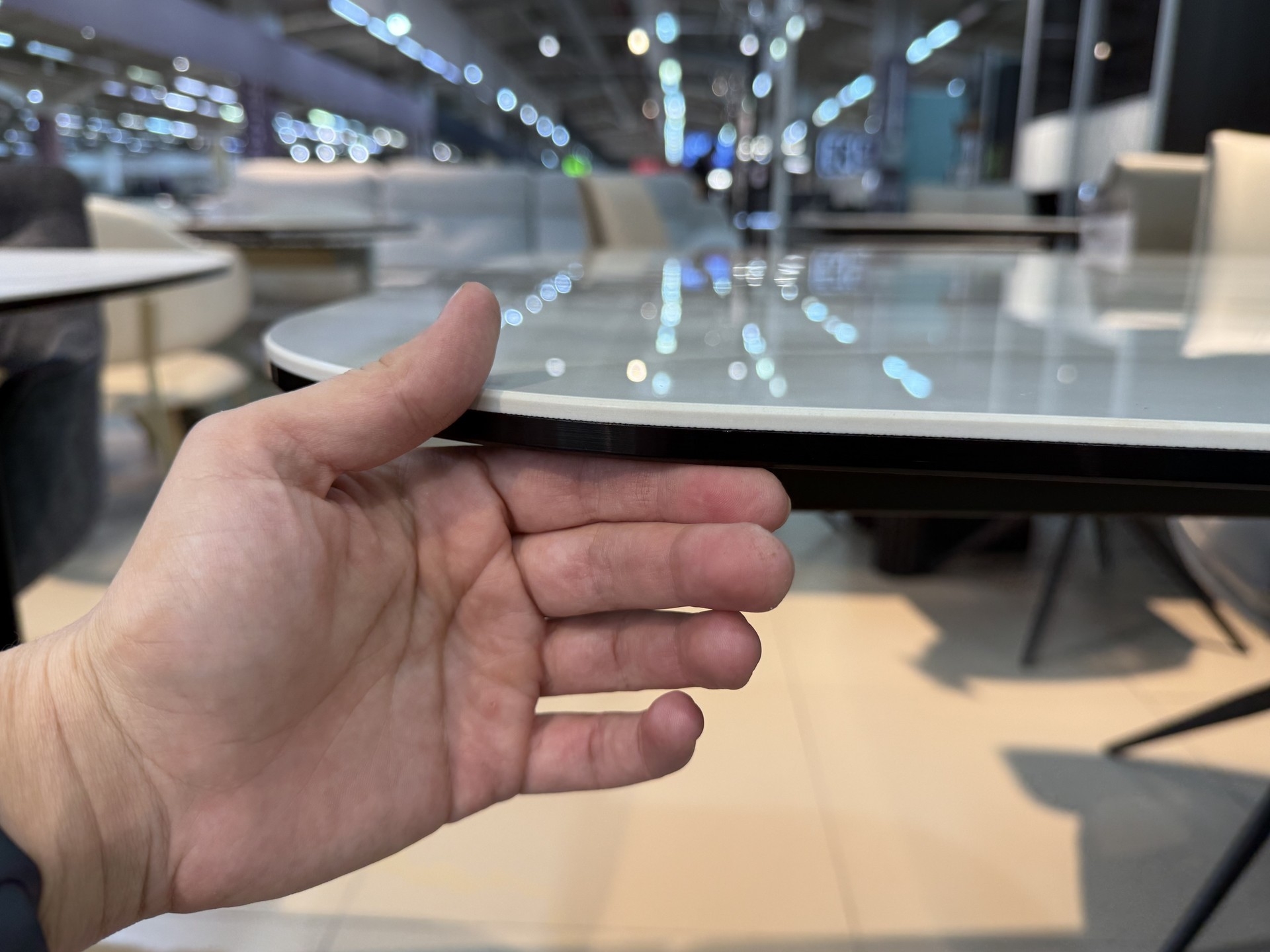 Глянцевая керамика, толщина столешницы 13 мм (5 мм керамика + 8 мм закаленное стекло), не впитывает загрязнения, термостойкая.