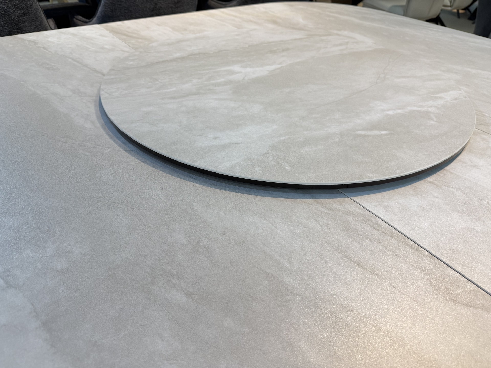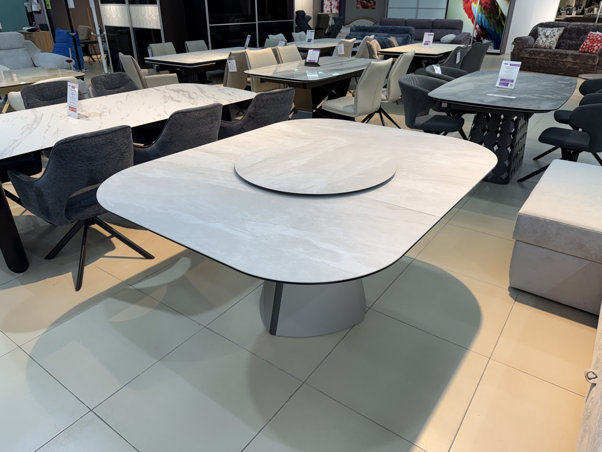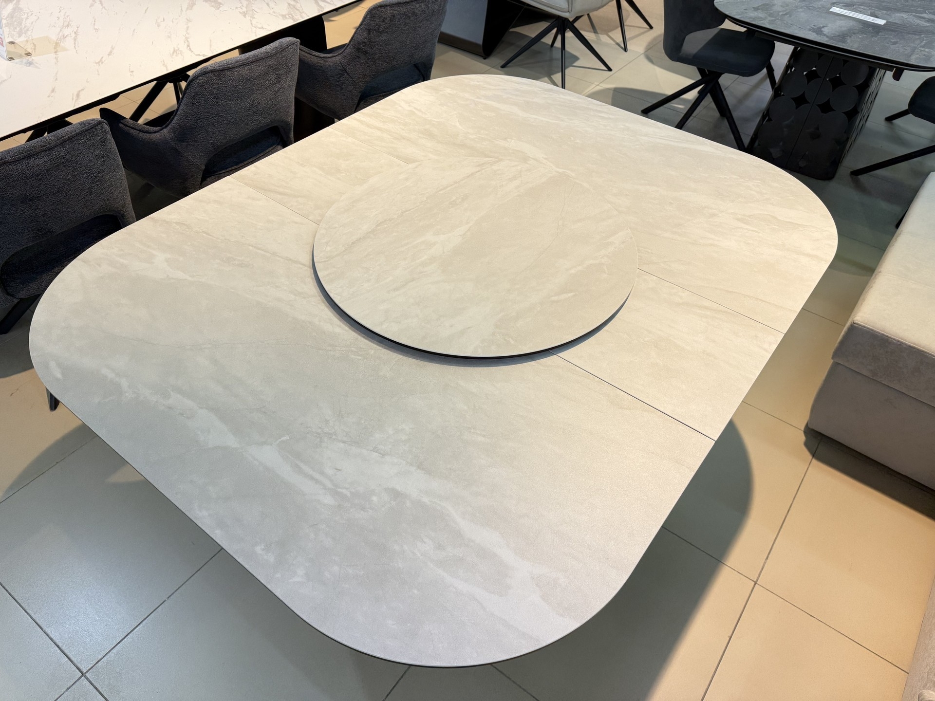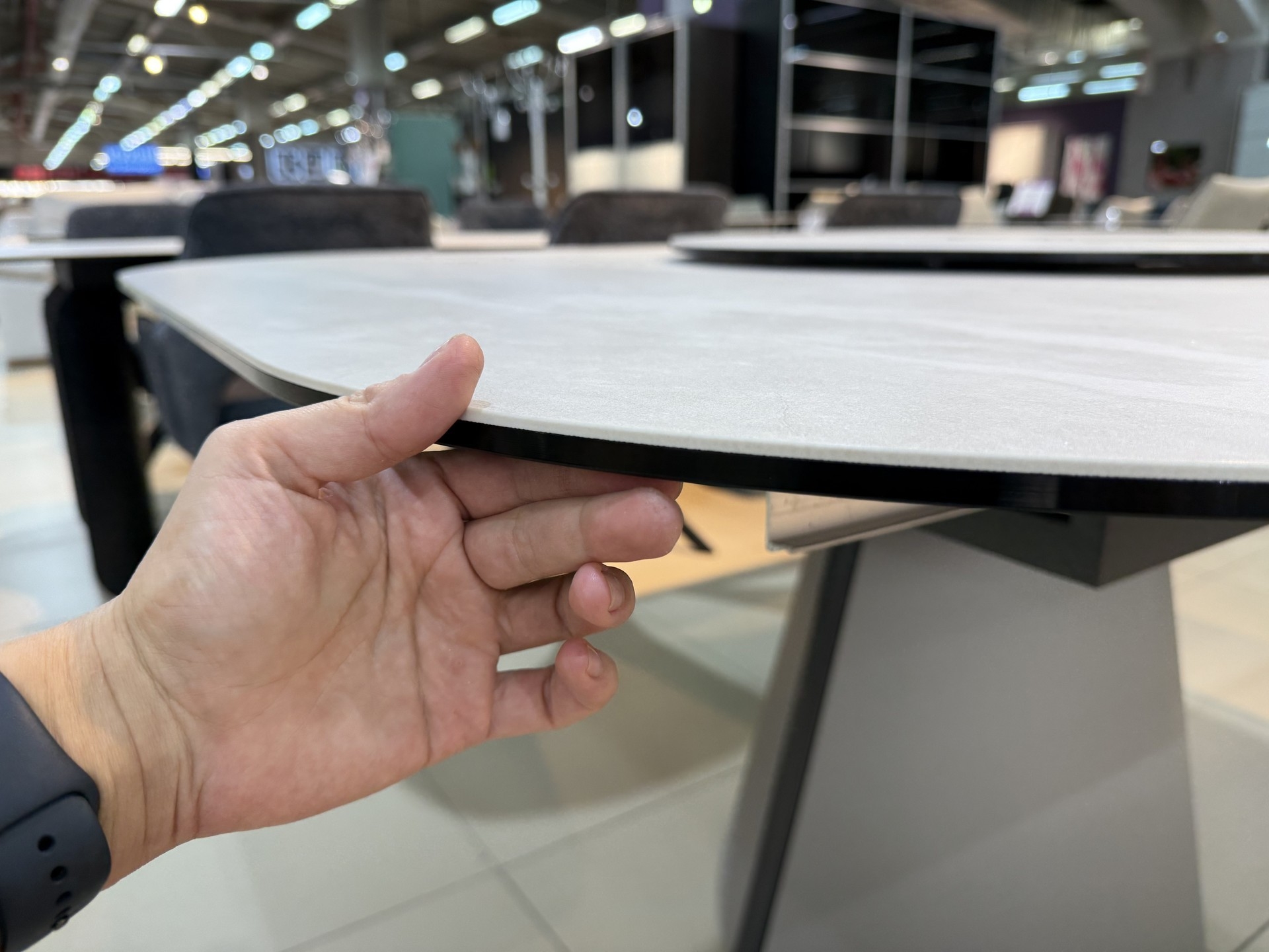 Керамическая столешница матовая, не впитывающая загрязнения, термостойкая, толщина 11 мм (8 мм испанская керамика + 3 мм закаленное стекло), необычность стлу придает дополнительная.ю вращающаяся, керамическая накладка- менажница.