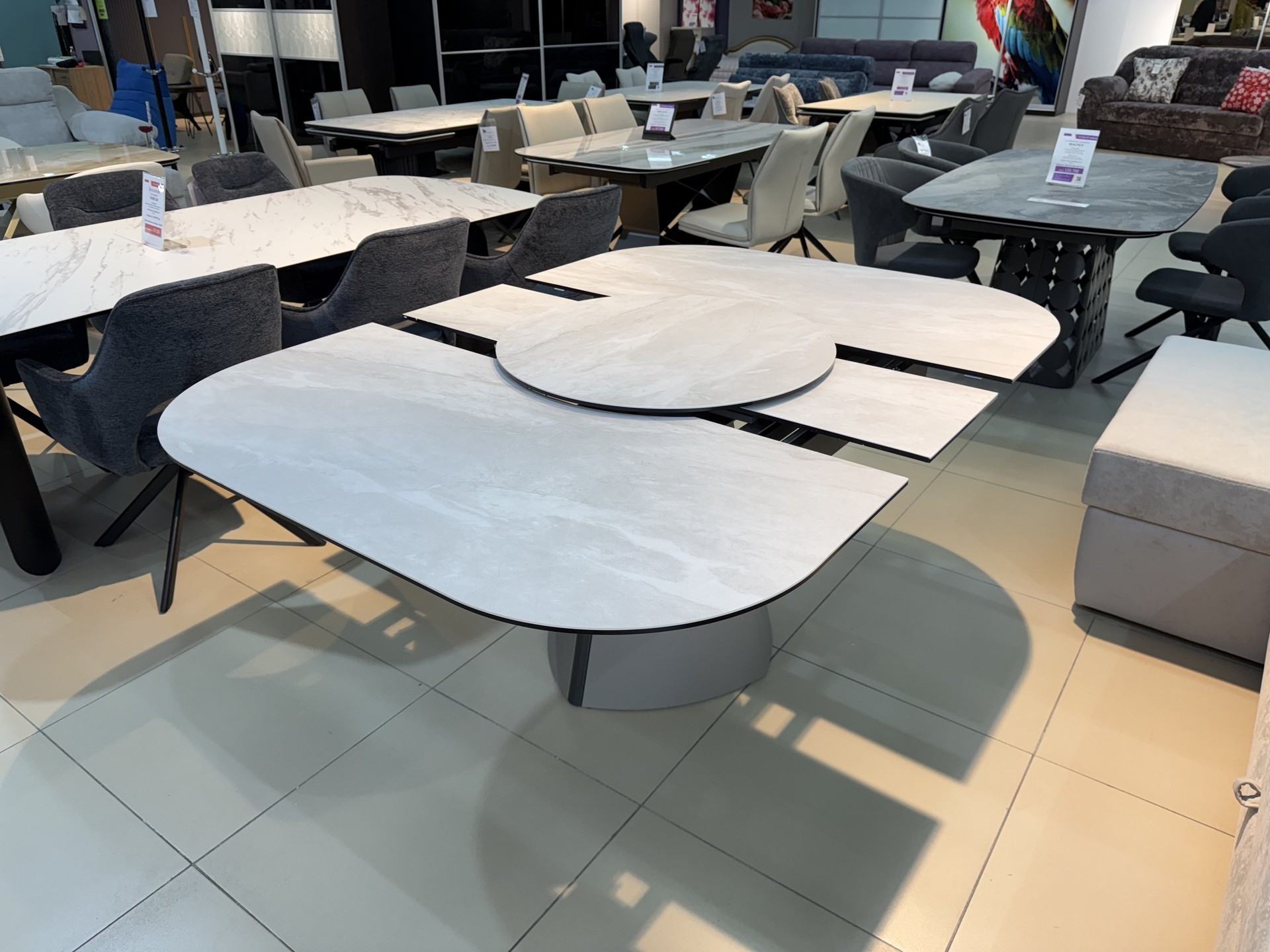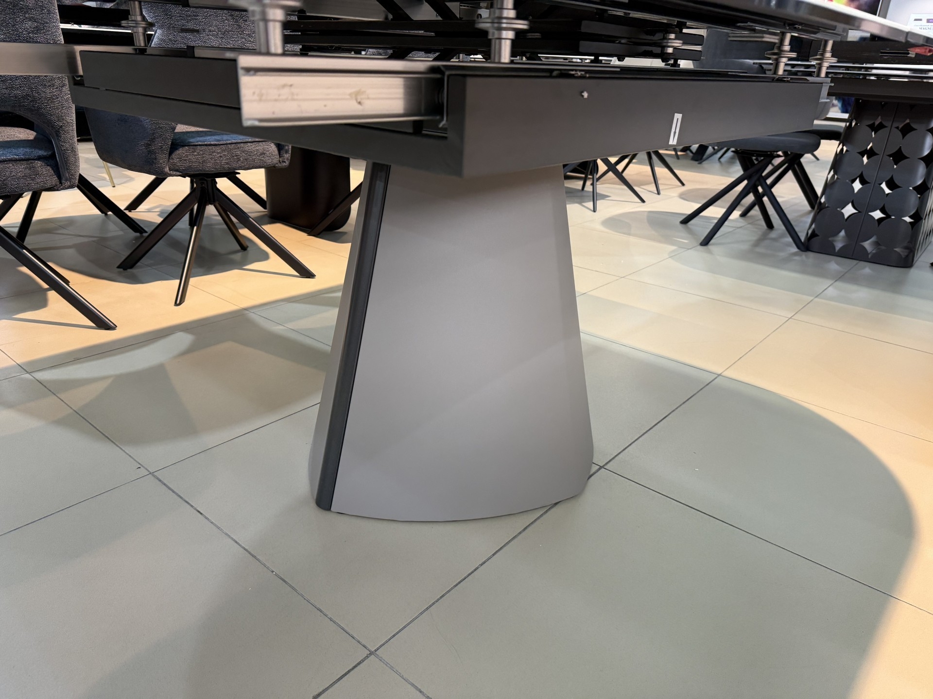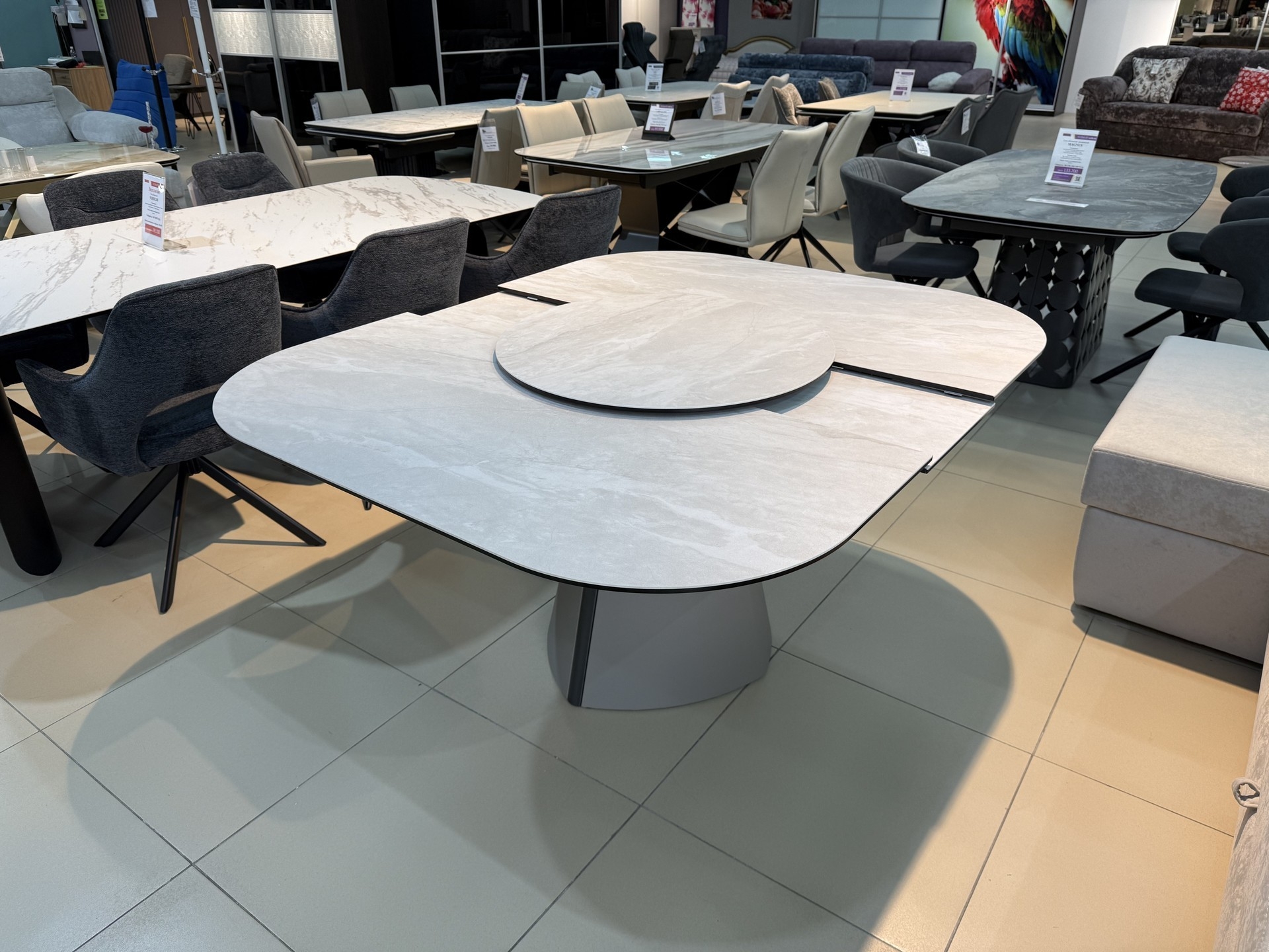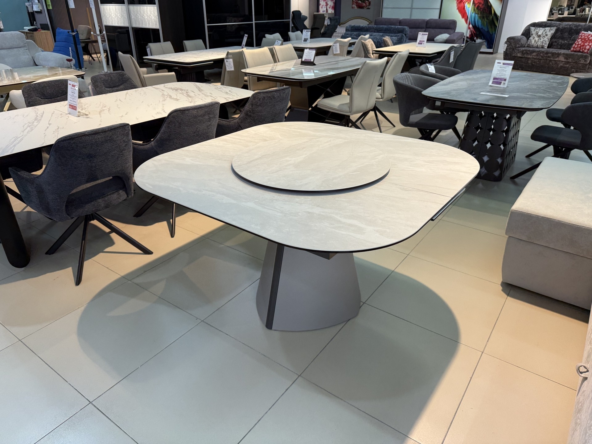 Керамическая столешница матовая, не впитывающая загрязнения, термостойкая, толщина 11 мм (8 мм испанская керамика + 3 мм закаленное стекло), необычность стлу придает дополнительная.ю вращающаяся, керамическая накладка- менажница.