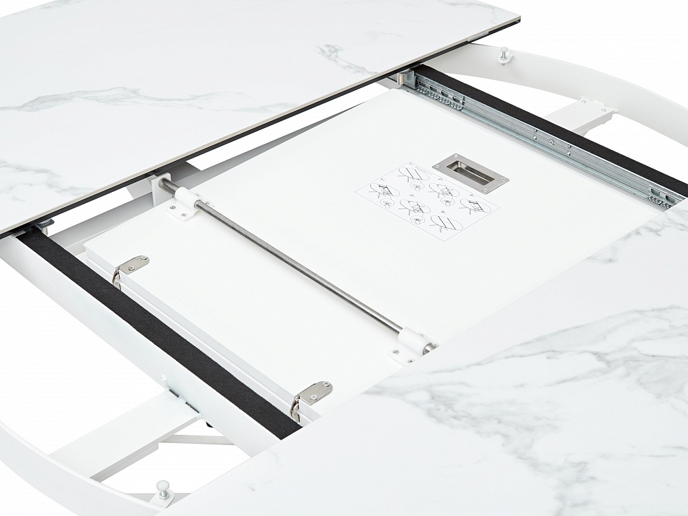 13,5 мм (5,5 мм керамика + 8 мм стекло). Использована керамика в светлом оттенке с легким мраморным рисунком, придающим изделию утонченность и современный вид. Стол раскладывается по центру столешницы при помощи вставки с механизмом "бабочка" из МДФ, ширина 50 см.
